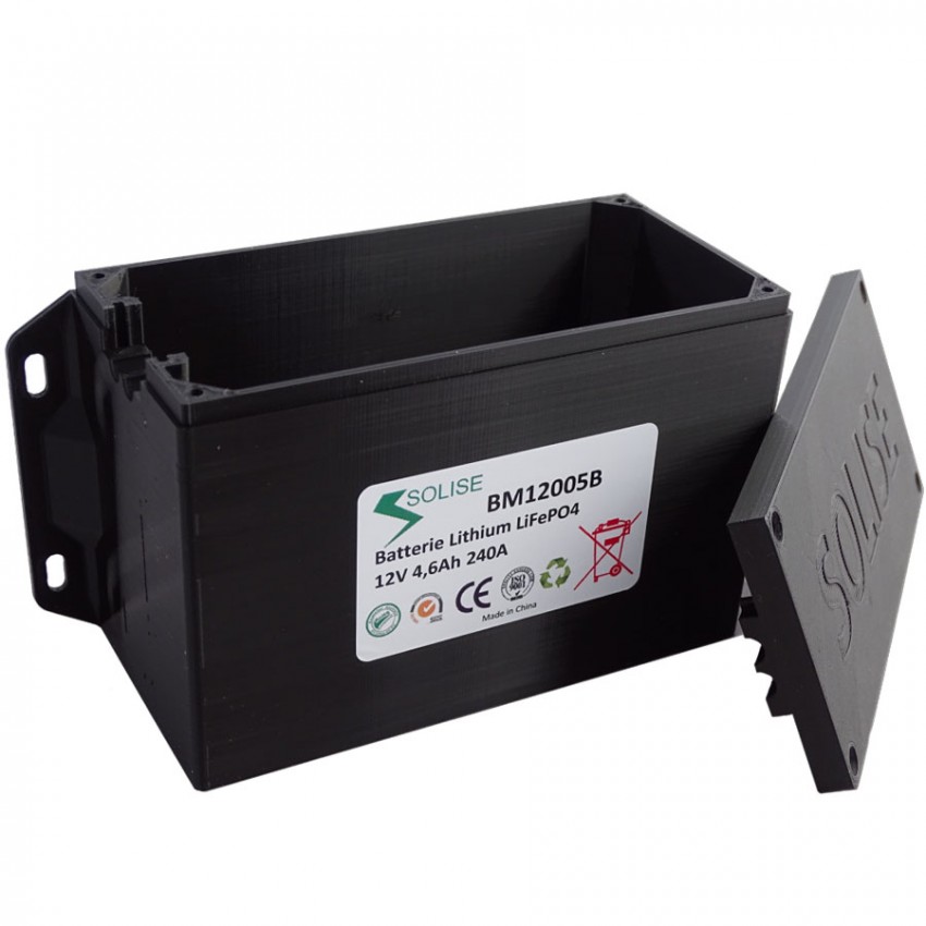 Solise propose pour sa batterie CCA240 (ref. BM12005) , ce boitier fabriqué en impression 3D. Il protégera votre batterie et facilitera son adaptation grâce à ses pattes de fixation latérales avec perçages M5.