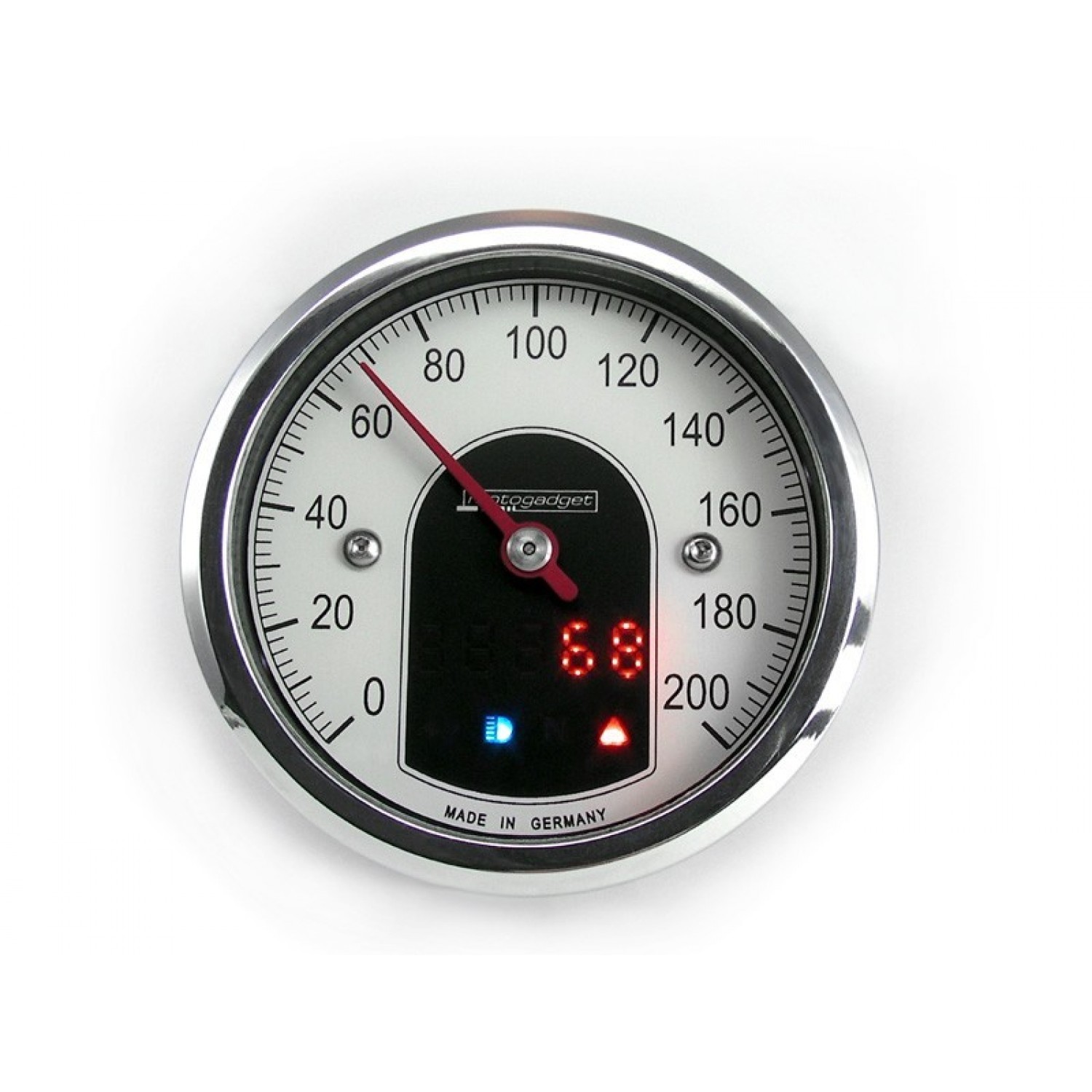Ainsi, le motoscope Tiny est très discret avec son aspect "classique" mais renferme une technologie dernier cri. Fonctions: indication de vitesse jusqu'à 200 km/h (ou mph) par aiguille - vitesse supérieure à 200 affichée numériquement par LED (km/h ou mph), kilométrage partiel (km ou mi), kilométrage total (km ou mi ), la vitesse maximale (km/h ou mph), le temps, 4 témoins à LED.