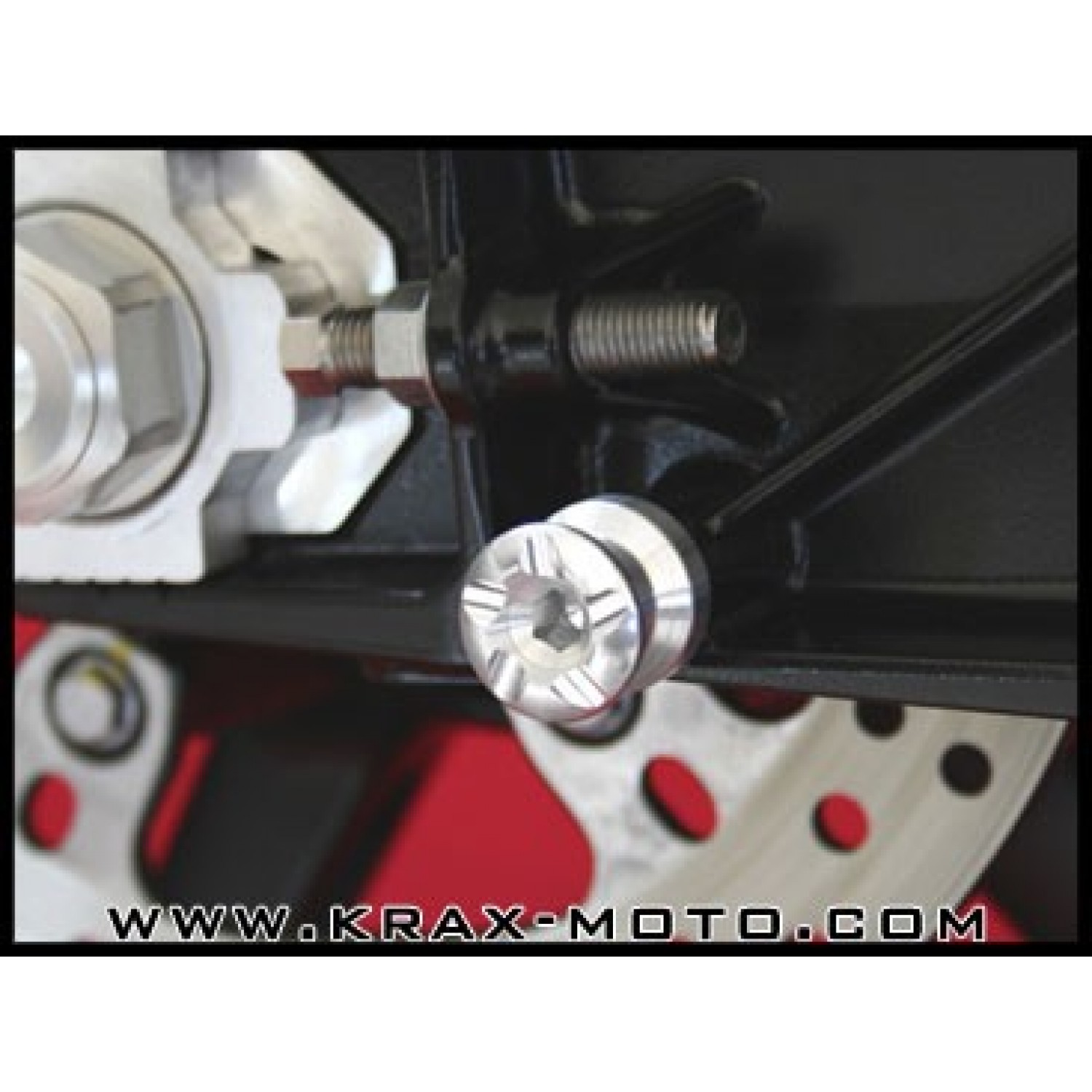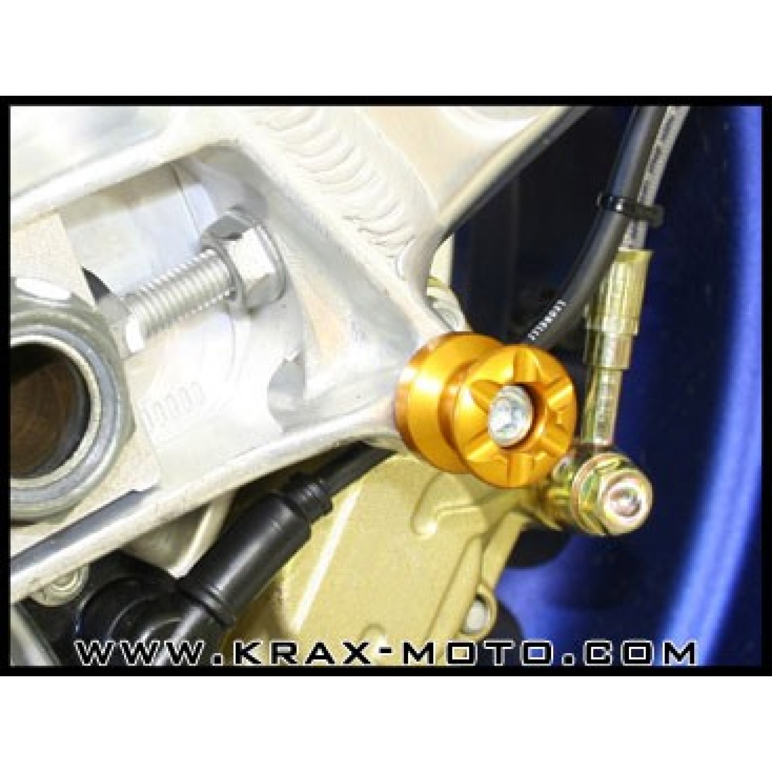 Cette paire de diabolos de béquille est usinée par Evotech et se vissera tout simplement sur votre bras oscillant afin de pouvoir utiliser une béquille de stand. Ils sont constitués du diabolo en alu, et d'une vis M6 en avier galvanisé.