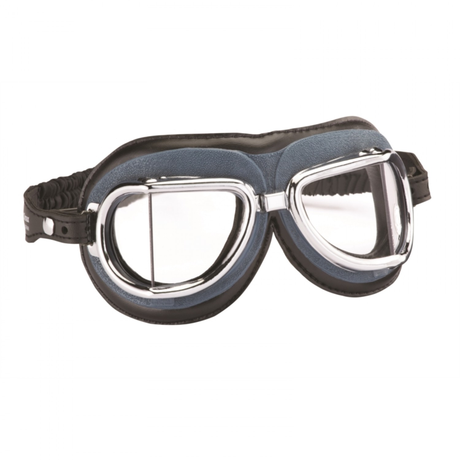 Ces lunettes de la marque Climax 513, qui fabrique en Espagne depuis 1945, sont constituées d'un masque en cuir noir rembourré de mousse et cadre bleu, avec cercles en métal chromé. Les verres sont en polycarbonate anti-rayure, avec angle panoramique.