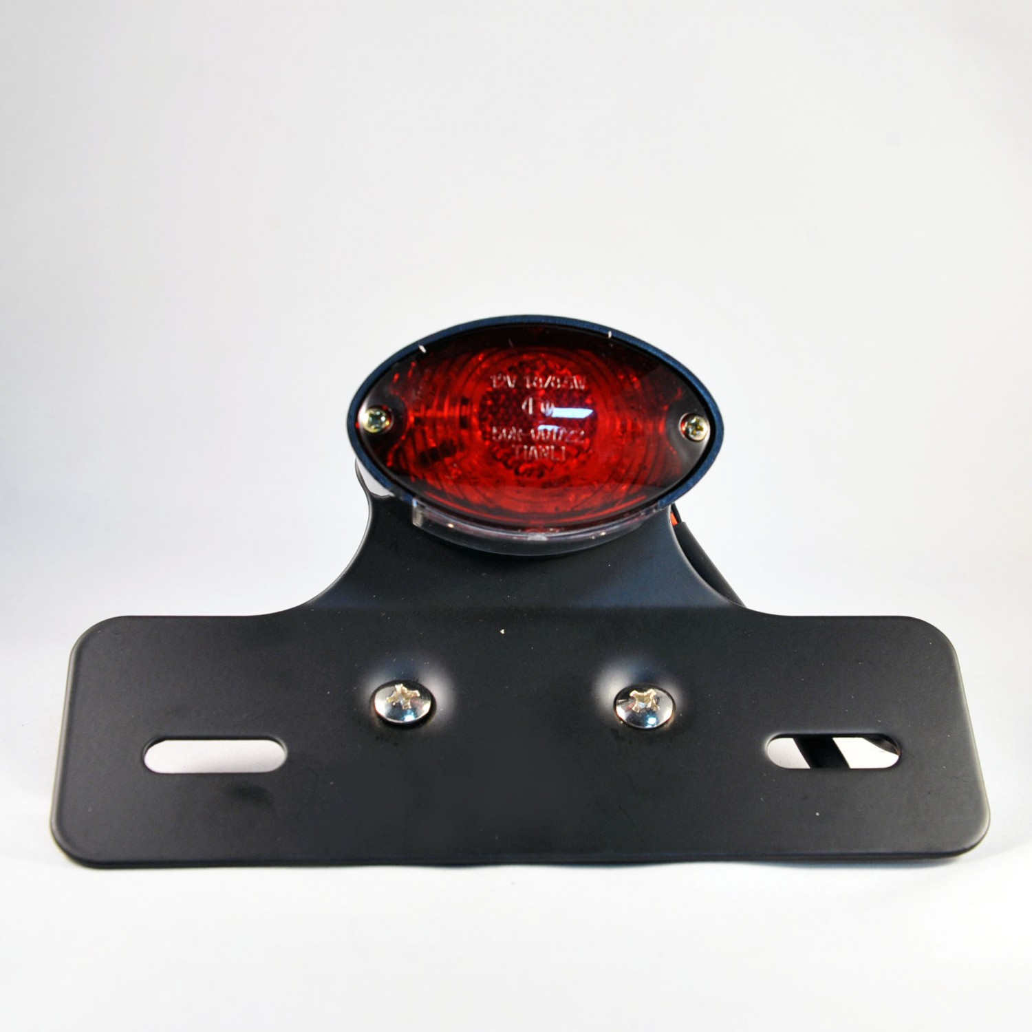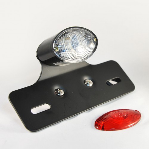 Ce feu arrière "Ogive" est livré avec un cabochon blanc et un cabochon rouge. Il est monté sur un support de plaque en acier noir et fait office d'éclairage de plaque. Feu à leds.