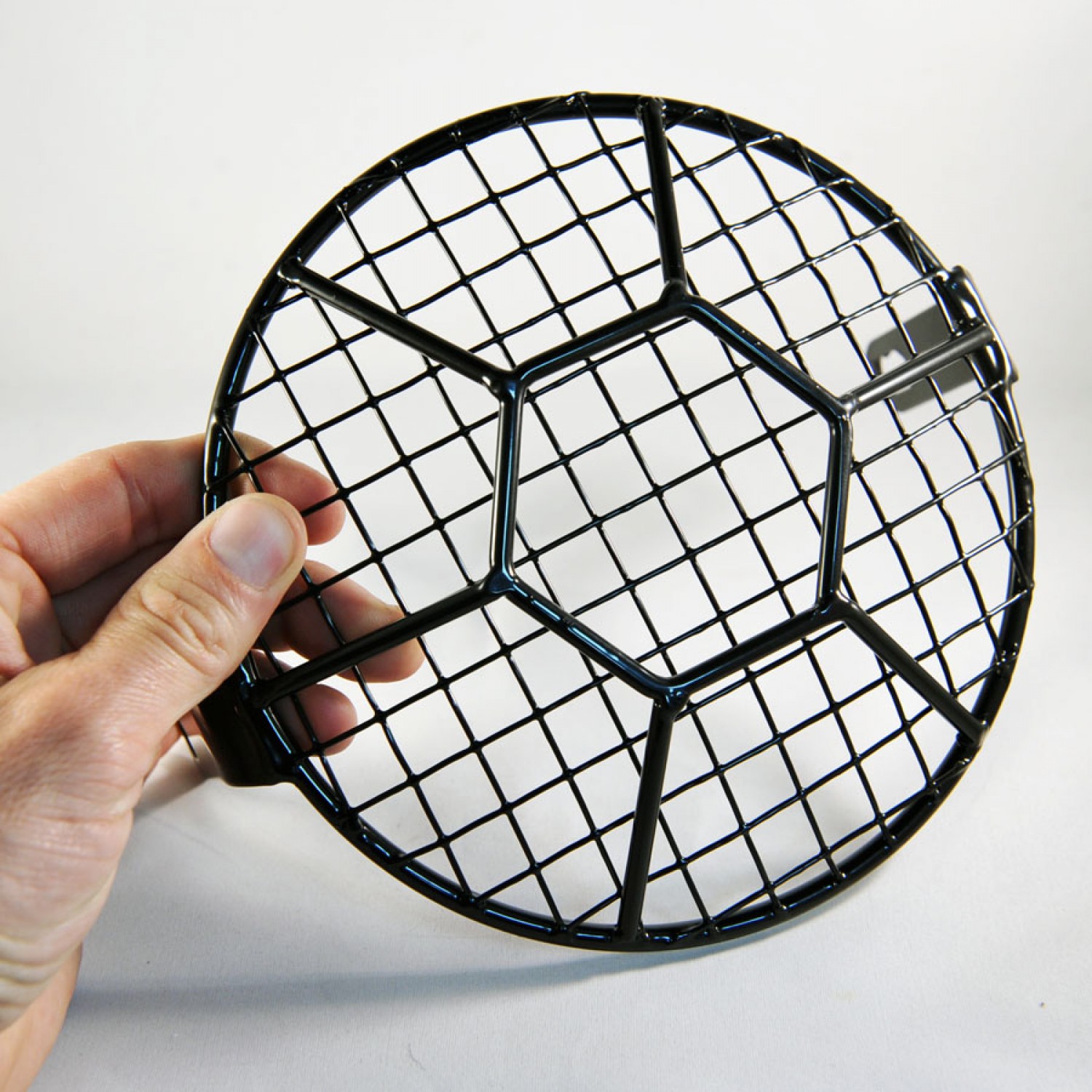 Cette grille de phare Hexa vintage type scrambler est en acier peint noir à l'Epoxy. La grille mesure 165mm de diamètre, les pattes de fixation mesures 70mm de long, possèdent un perçage M8 et pourront se monter sur des phares de 160 à 180mm de diamètre (Pattes légèrement flexibles) avec fixations latérales bien sûr.