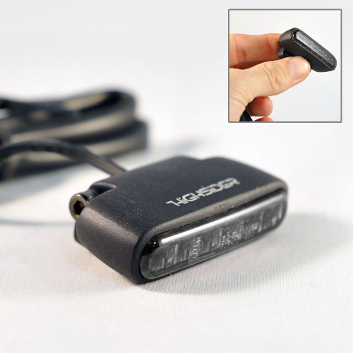 Ce mini feu à leds avec corps en métal, de la marque allemande Highsider, est homologué et possède un petit support orientable.