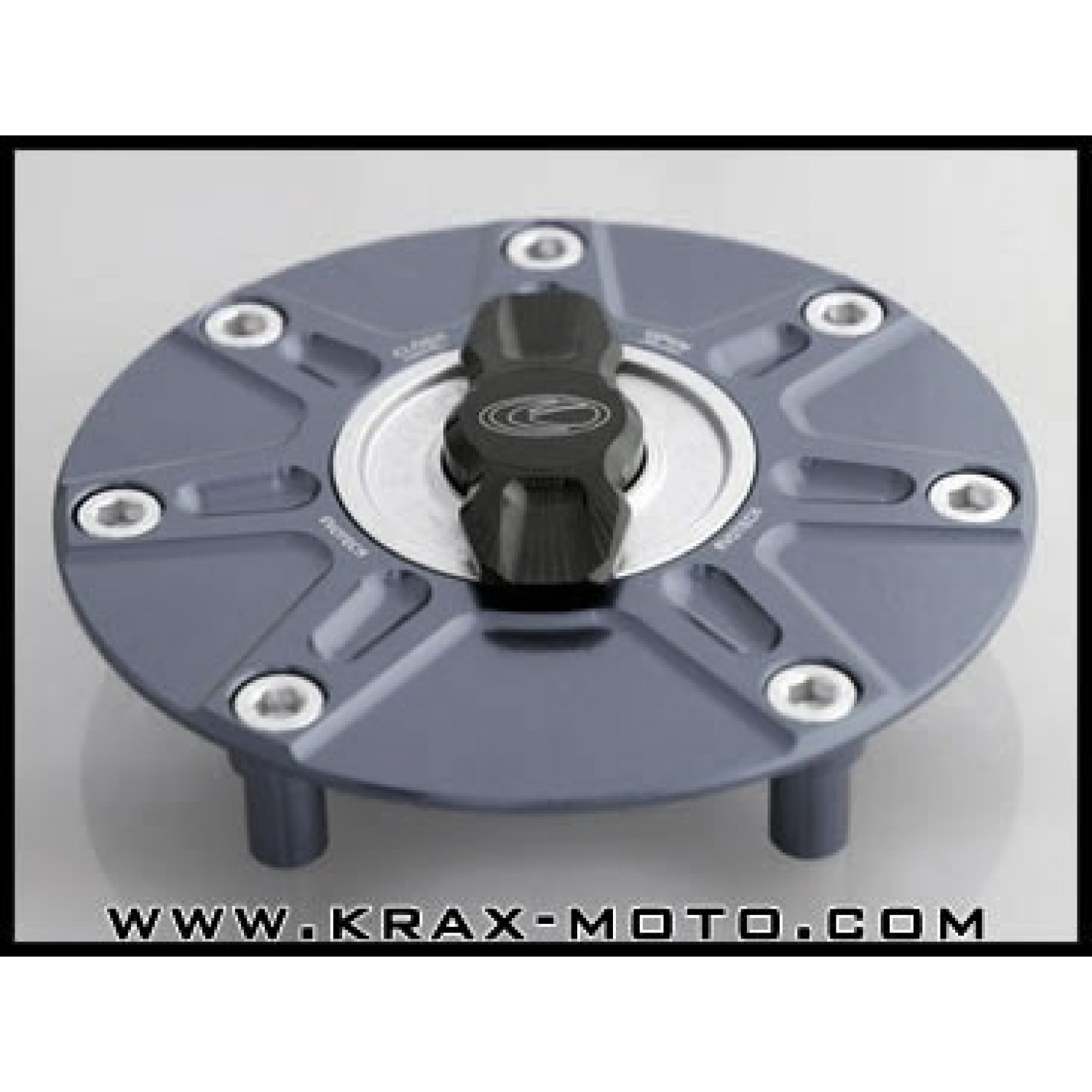 Cette trappe à essence Evotech pour VFR1200 est entièrement en aluminium taillé dans la masse et possède une ouverture rapide grace à un mécanisme d'ouverture spécial: Il suffit d'appuyer le levier et de le tourner d'environ 35°. IMPORTANT: Bien choisir la couleur du tour et préciser la couleur du centre et des vis dans la commande. Elle conserve une prise d'air de manière à assurer une bonne aspiration sans risque de perte de carburant. De plus elle est fournie avec la visserie en aluminium indispensable pour le montage. La trappe reprend le joint inférieur de la trappe d'origine de manière à assurer son maintien correct sur le réservoir. La couleur de la partie extérieure, du disque central et des vis est au choix. Le levier de man?uvre est lui toujours de couleur noire.